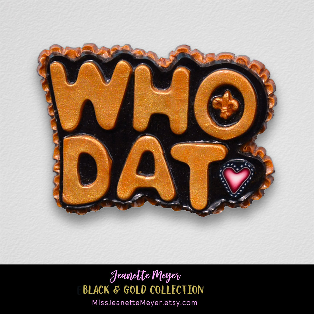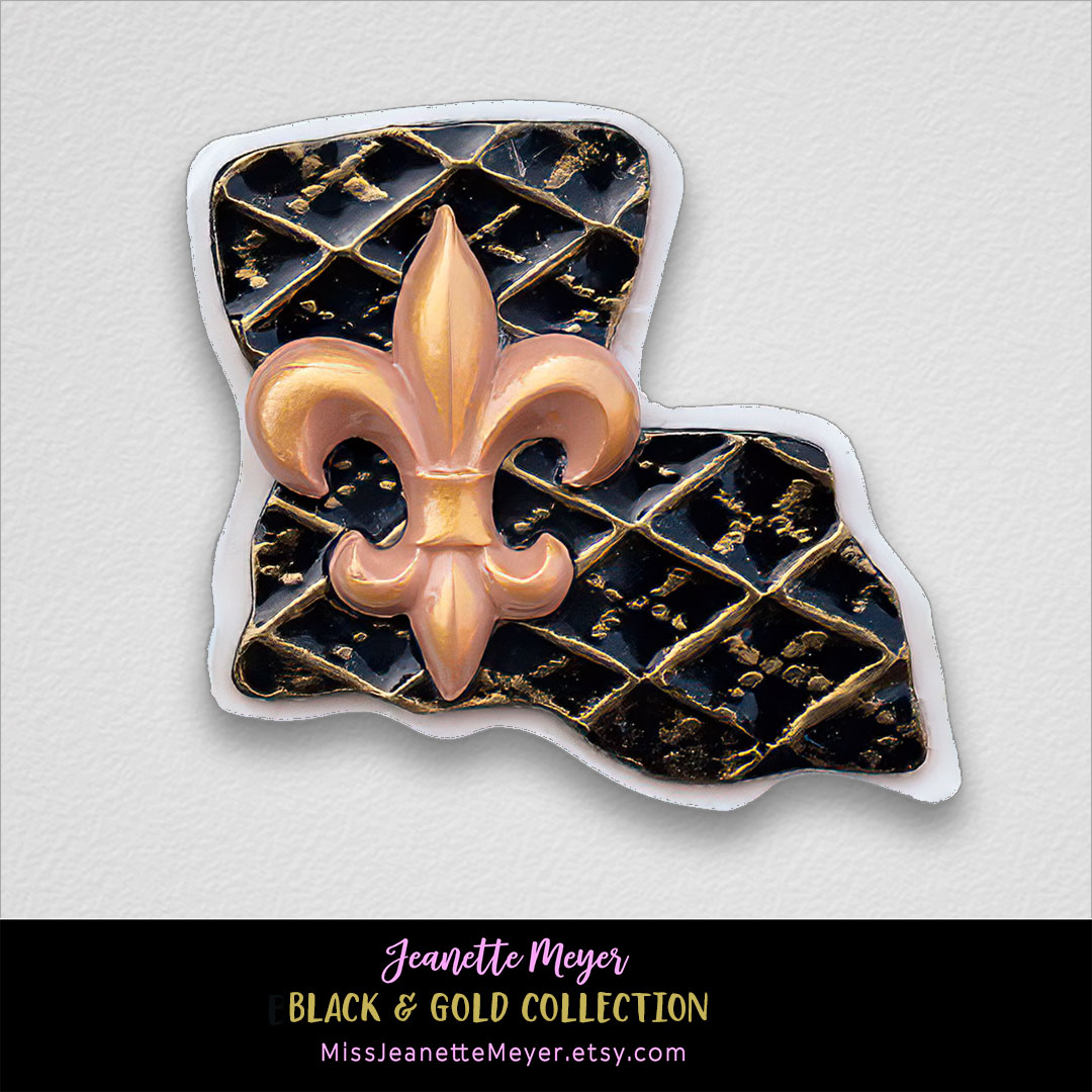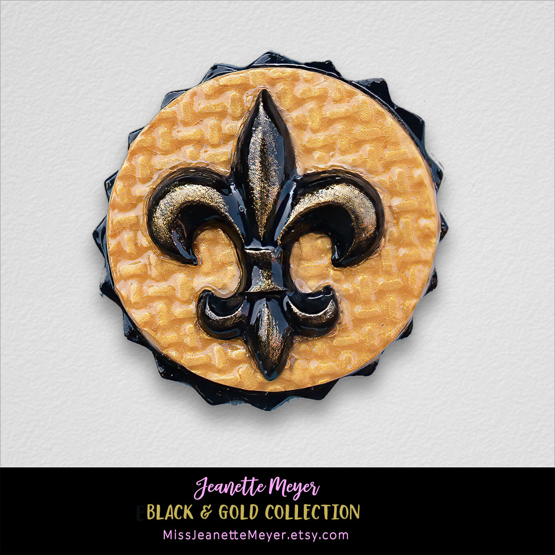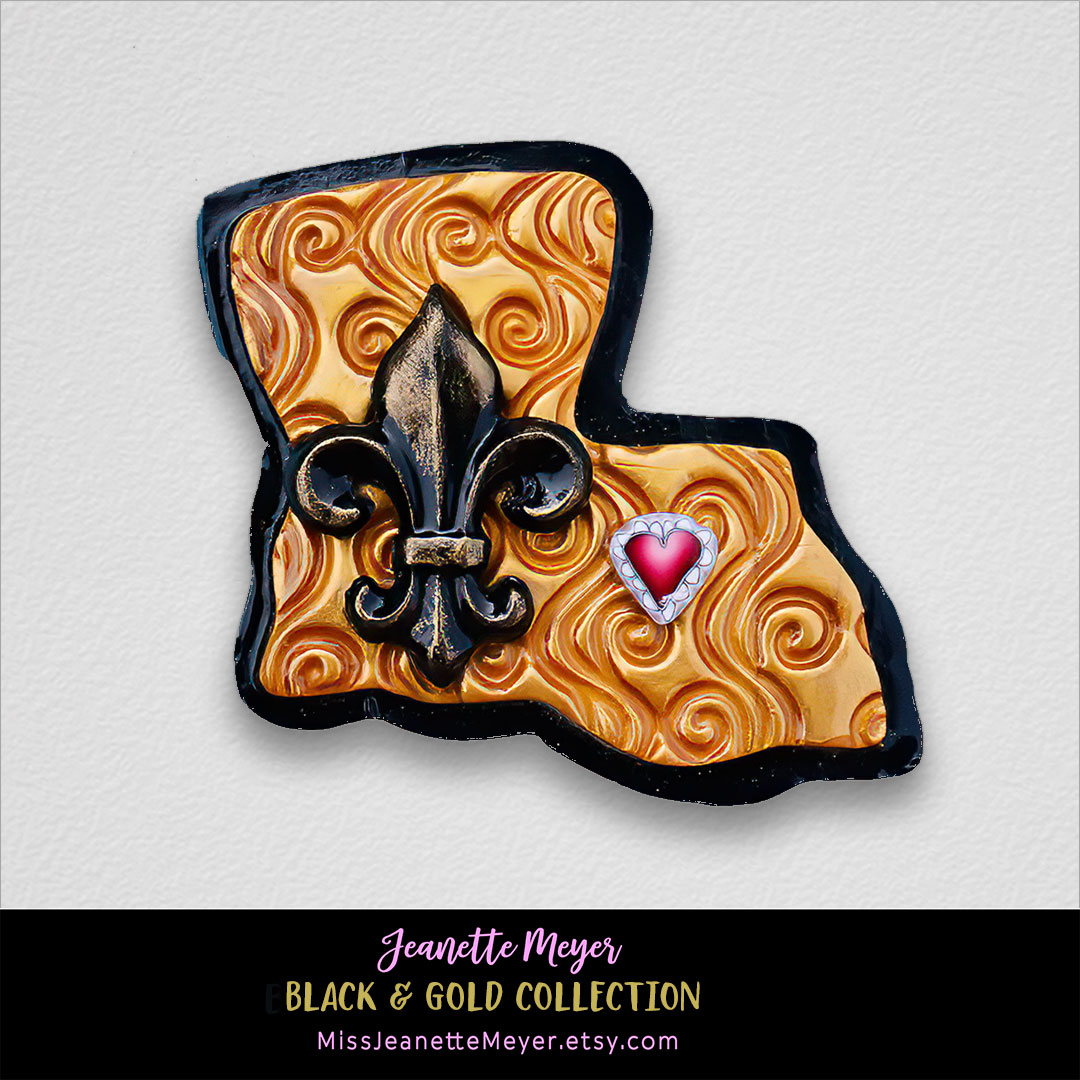 Explore the magic of Jeanette Meyer’s New Orleans Black and Gold collection, where every polymer clay pin and magnet celebrates the iconic colors of the home team. Each piece is a unique work of art that embodies the spirit of the Crescent City. These creations capture the rich culture and lively charm of New Orleans, serving as miniature tributes to its rhythm and soul—a testament to the city’s history, culture, and vibrant team spirit.